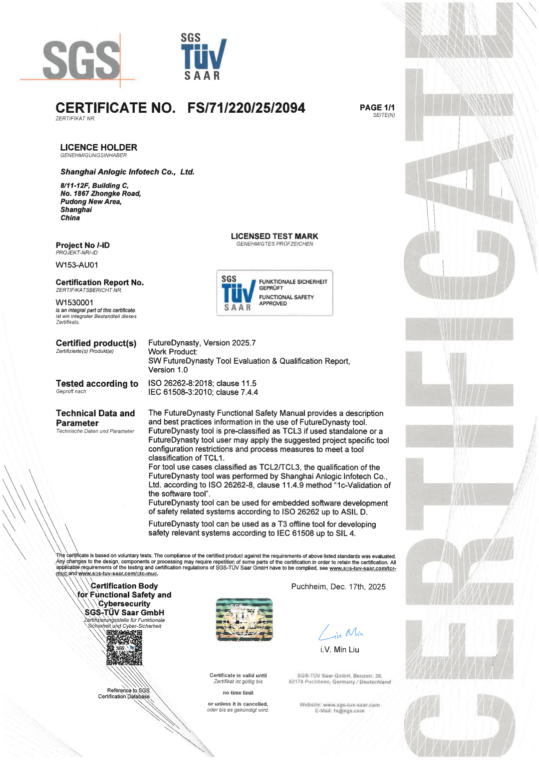 本次认证涵盖两大核心产品:TangDynasty专注于FPGA硬件开发,集成了Formal形式化验证等增强型安全措施;FutureDynasty则是面向FPSoC嵌入式软件开发的集成环境,深度符合功能安全流程规范。在ISO 26262标准下,当用户严格遵循产品手册中针对特定项目推荐的工具配置与流程措施后,工具置信度可提升至最高的TCL 1等级,从而支持ASIL D(汽车功能安全最高等级)和SIL 4(工业功能安全最高等级)的最高安全等级开发。两者共同构建了从设计到验证的全流程安全闭环。