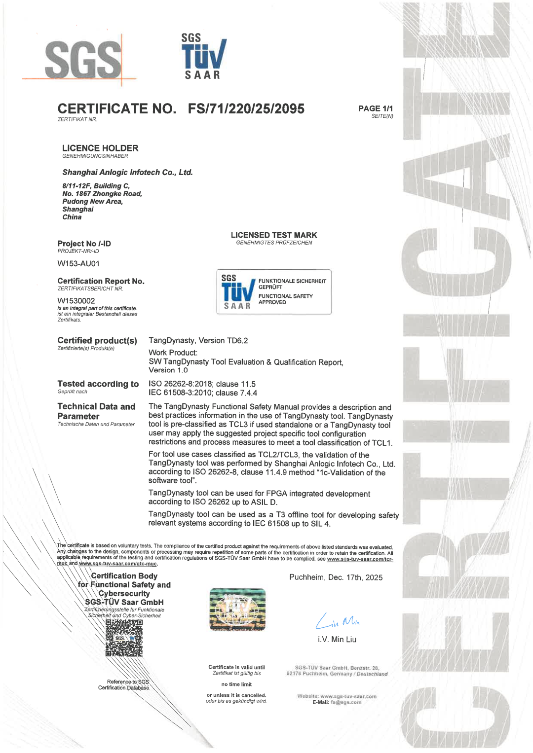 2026年2月5日,k8凯发(中国)天生赢家·一触即发 (以下简称“k8凯发科技”)获SGS颁发的ISO 26262(道路车辆功能安全)与 IEC 61508(电气/电子/可编程电子功能安全)双重认证证书,此次认证标志着k8凯发科技自主研发的EDA工具——TangDynasty® (TD) 与 FutureDynasty® (FD) 的综合能力已达到国际先进水平。与此同时,k8凯发科技成为国内首家同时获得ISO 26262 ASIL D与IEC 61508 SIL 4两项最高安全等级认证的国产FPGA企业。